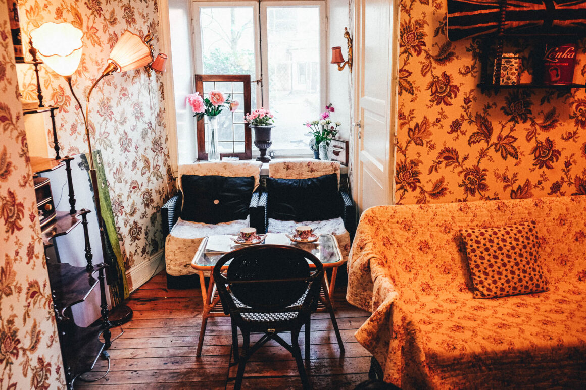 Jag och min kompis går istället in in nästa rum med blommiga tapeter, gamla överkast som sofföverdrag och plastblommor i krukorna. Det känns nästan exakt som att kliva in i ett sommarboende på landet, inklusive hopplockade prydnader och udda utemöbler där sitthöjden inte är särskilt kompatibel med borden. Charmigt enligt vissa, klurigt enligt andra.