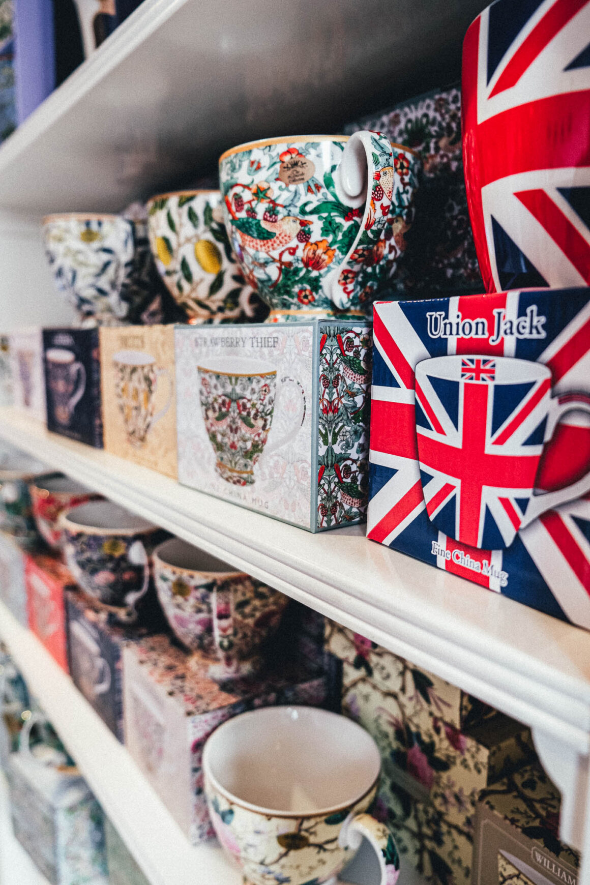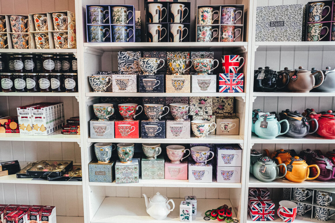 Japp, här är temat tebjudningar från början till slut. På hyllorna står rad efter rad med muggar, kannor, kex och te i olika smaker och utföranden. In till vänster väntar en större salong där det blommiga porslinet står uppdukat redo för tebjudning. Här inne sitter ett större sällskap bestående av ett tiotal damer i sina bästa år – kanske en bokklubb eller ett födelsedagsfirande?
