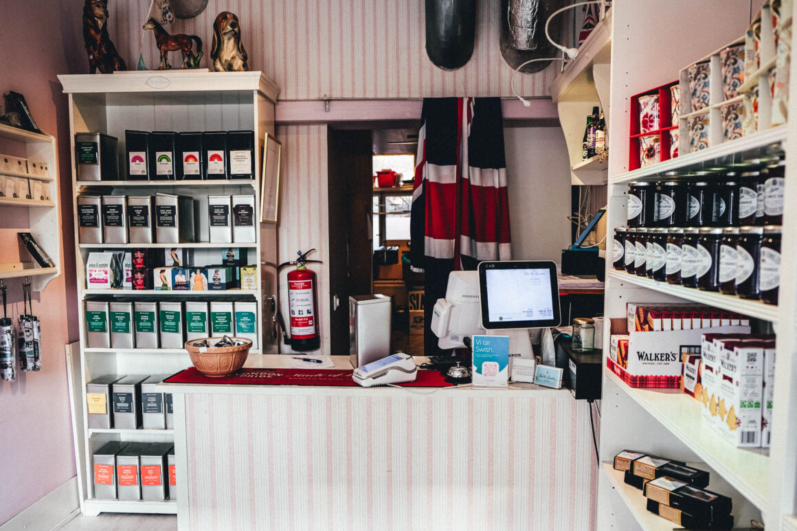 …som är ganska liten. I skyltfönstret står ett gäng temuggar och tekannor som löfte om vad som väntar innanför dörren.