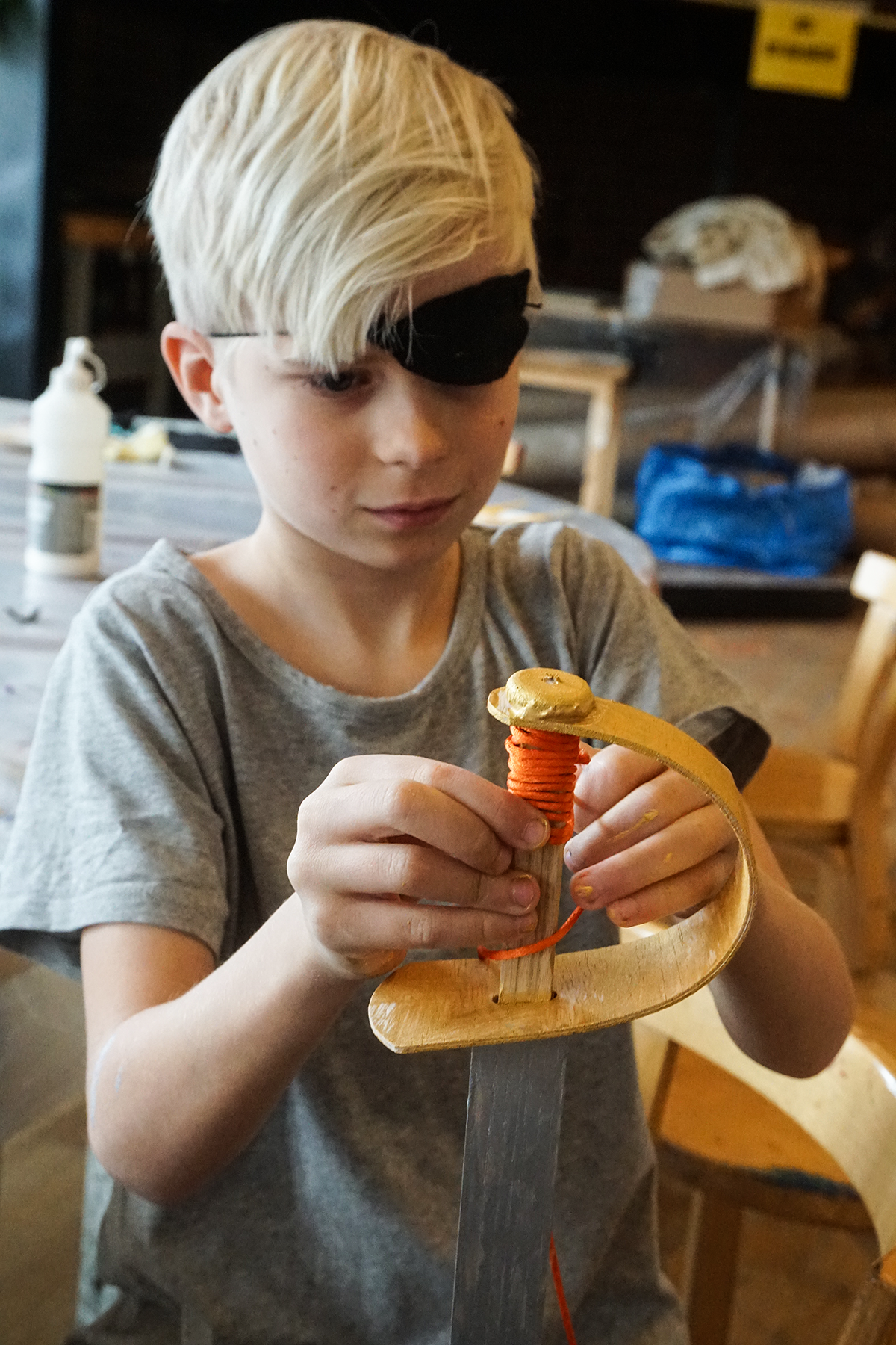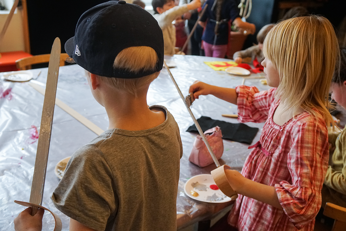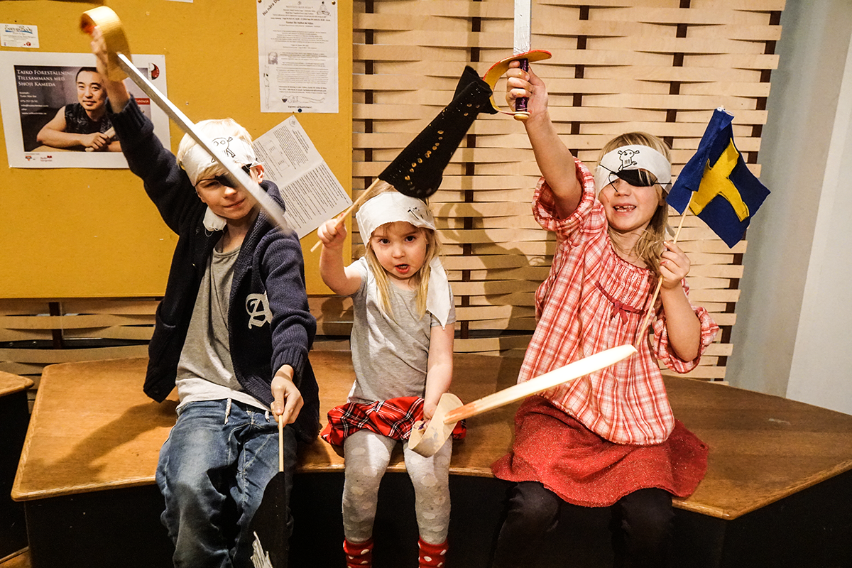 Våra äldre barn Sebastian (9 år) och Julia (7 år) tycker piratvisningen är väldigt spännande och lyssnar koncentrerat på de spännande historierna som pedagogen berättar. Vår treåring Nelly lyssnar ungefär 2,5 sekunder innan vi får bära iväg henne för att inte hon ska överrösta barngruppen med sitt tjo och tjim. Hennes rätta element är däremot verkstaden, dit alla barn får gå och tillverka piratsvärd, ögonlappar och piratflaggor efter visningen. Vi betalar 50 kronor per barn i materialkostnad, men materialet är riktigt fint och vi stannar länge, vilket innebär att aktiviteten är värda varenda öre.