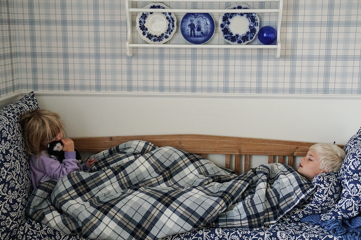 Julia ville vara kvar i Stockholm (hon ville absolut inte missa helgens fotbolls- och innebandymatch!) och fick sova över hos en kompis. Det var med andra ord bara två barn som kurade upp i kökssoffan igår morse…