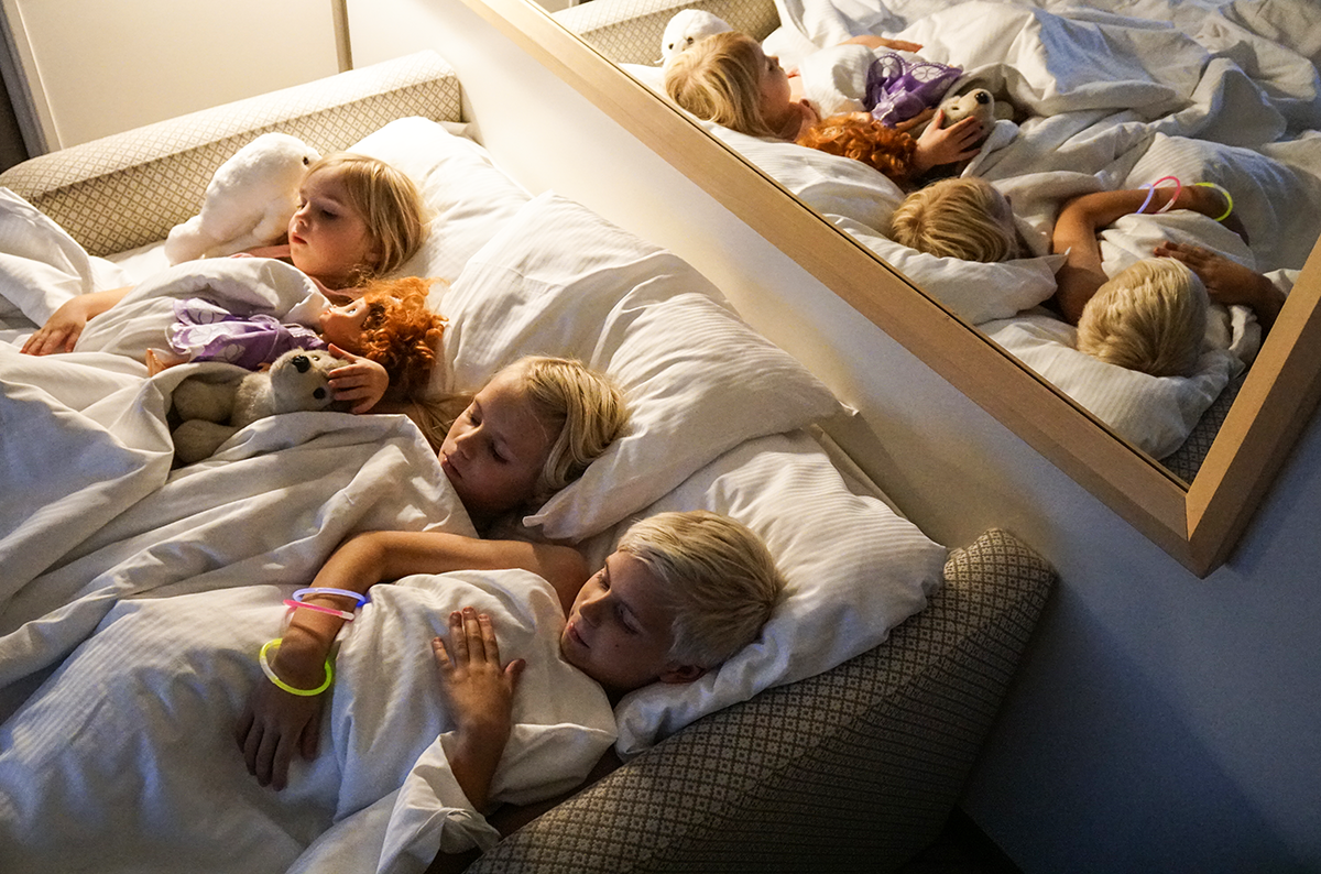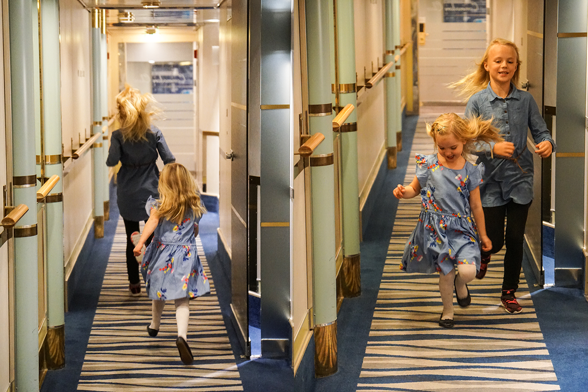 Ni vet känslan när man har checkat in på ett riktigt fint hotellrum och egentligen bara vill stanna där resten av dagen? Precis så är mitt första intryck av Commodorehytten som vi har nöjet att husera i. Hytterna, som har havsutsikt och är 20-25 kvadratmeter stora, finns i två olika varianter: 1) med balkong och badkar eller 2) utan balkong och dusch istället för badkar (vi bor i en sådan variant). Vi bor i hytt nummer 11312, som i princip fungerar som en tvårummare. En liten hall, med toalett in till höger, leder in till ett kombinerat sovrum och vardagsrum, som kan delas av med hjälp av ett draperi. Under natten förvandlas (bädd)soffan snabbt till en säng, som rymmer våra tre barn i åldrarna 10, 8 och 4 utan problem. Här finns också en garderob med plats för väskor och jackor, en TV med barnkanal och en minibar där frukt och dricka ingår. Det finns givetvis flera andra hyttkategorier och boendealternativ i olika prisklasser att välja på, allt från Executive Suite till C-hytt.