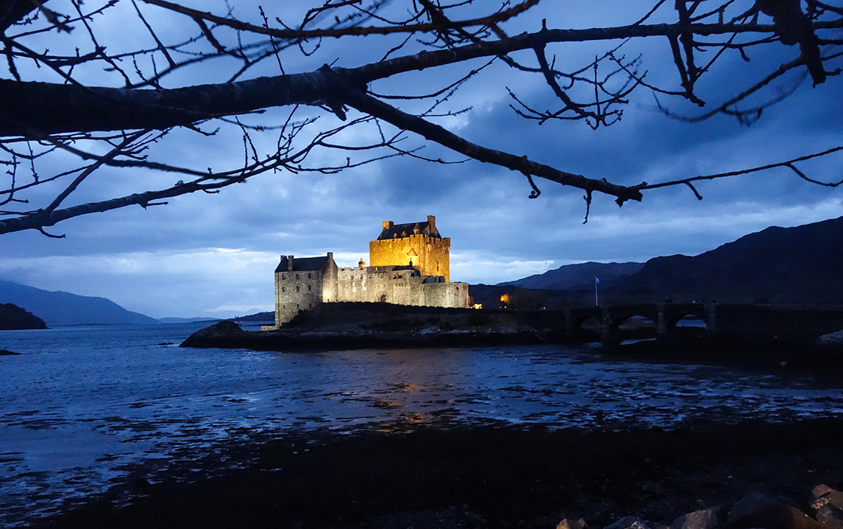 Vi stannar till vid Eilean Donan Castle en sen decemberkväll när det håller på att blåsa upp till storm. Det berömda slottet ligger på en ö vid inloppet av Loch Duich, strax innan bron över till Isle of Skye, och förblir ett av mina absoluta favoritslott i Skottland (jämsides med Dunnottar). Läs mer: Slott i Skottland: mina tre favoriter i sagolandet